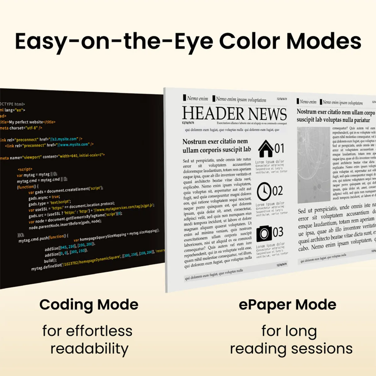 Para aquellos que disfrutan de las largas sesiones de lectura, el modo ePaper simula una pantalla de libro electrónico, equilibrando el texto y el fondo para reducir la fatiga ocular. El sensor de inteligencia de brillo ajusta activamente el brillo de la pantalla de acuerdo con los cambios de luz en su entorno de visualización, asegurando una experiencia de visualización cómoda de día a noche.
