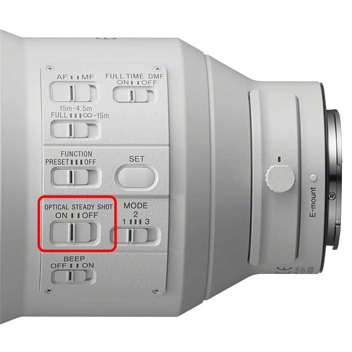 Cuando el interruptor DMF a tiempo completo está encendido, el enfoque manual se activa automáticamente cuando se opera el anillo de enfoque, incluso en el modo AF-C. La estabilización de imagen óptica SteadyShot incorporada incluye el MODO 2 para tomas con pannes y el MODO 3 para deportes dinámicos o acción de vida silvestre. El MODO 3 también proporciona una imagen de visor más estable para facilitar el encuadre.
