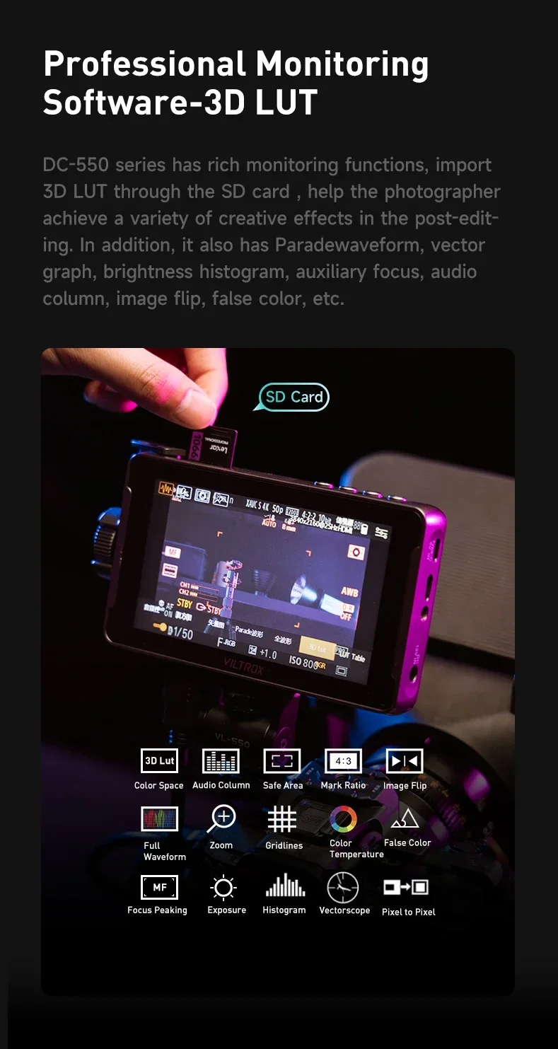 Importar LUT 3D personalizado a través de la tarjeta SD, que es conveniente para que los clientes usen cualquier modo de registro de cámara para disparar y monitorear, pero también conveniente para lograr una variedad de efectos de estilo creativo en la pantalla de postproducción, no admite el anillo de color LUT.